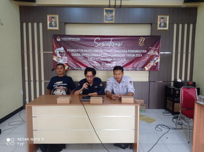 Mungkid, 19 September 2024 PPS dan sekretariat PPS Desa Mungkid telah melaksanakan Sosialisasi Pendaftaran Kelompok Penyelenggara Pemungutan Suara (KPPS) pada pilkada tahun 2024, di Balai Desa Mungkid. Kegiatan ini dihadiri oleh panwasdes, PPS desa Mungkid serta tokoh masyarakat. dalam kegiatan ini Ketua PPS, Alwan menyampaikan bahwa telah dibuka pendaftaran calon KPPS pada tanggal 17- 28 September 2024. berkas dapat diunduh di barcode pada brosur yang sudah PPS kirim lewat media sosial. Atau calon pendaftar bisa mendaftar langsung ke balai desa, dengan menemui sekretariat PPS Desa Mungkid.